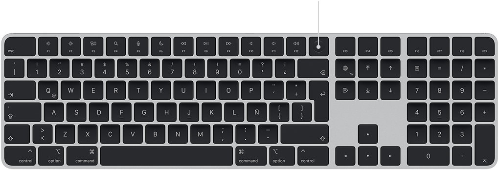 Flecha que indica la ubicación del sensor Touch ID en el Magic Keyboard, que se encuentra arriba de la tecla de borrar