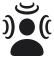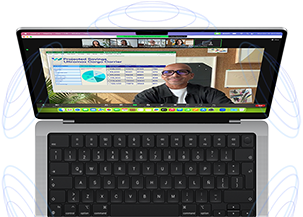 Imagen de una MacBook Pro rodeada de círculos azules para transmitir la sensación 3D del Audio Espacial. En la pantalla, se ve a una persona que usa la funcionalidad Visualización al Presentar en una reunión por Zoom para aparecer delante del contenido que está presentando