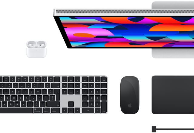 Vista desde arriba de algunos accesorios para la Mac: Studio Display, Magic Keyboard, Magic Mouse, Magic Trackpad, AirPods y cable de carga MagSafe