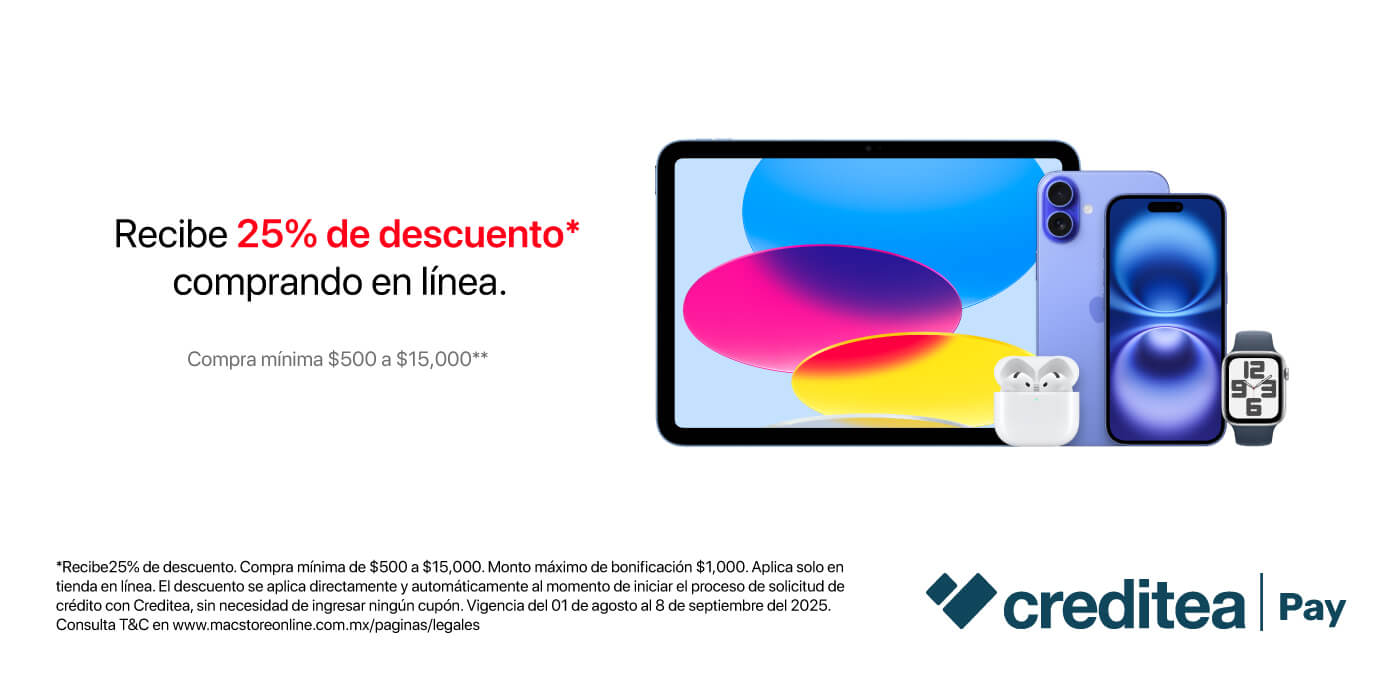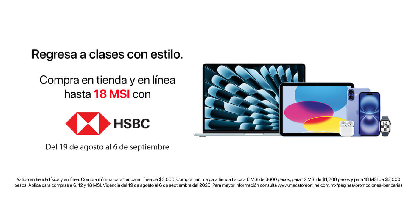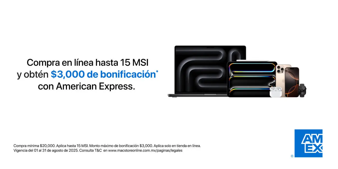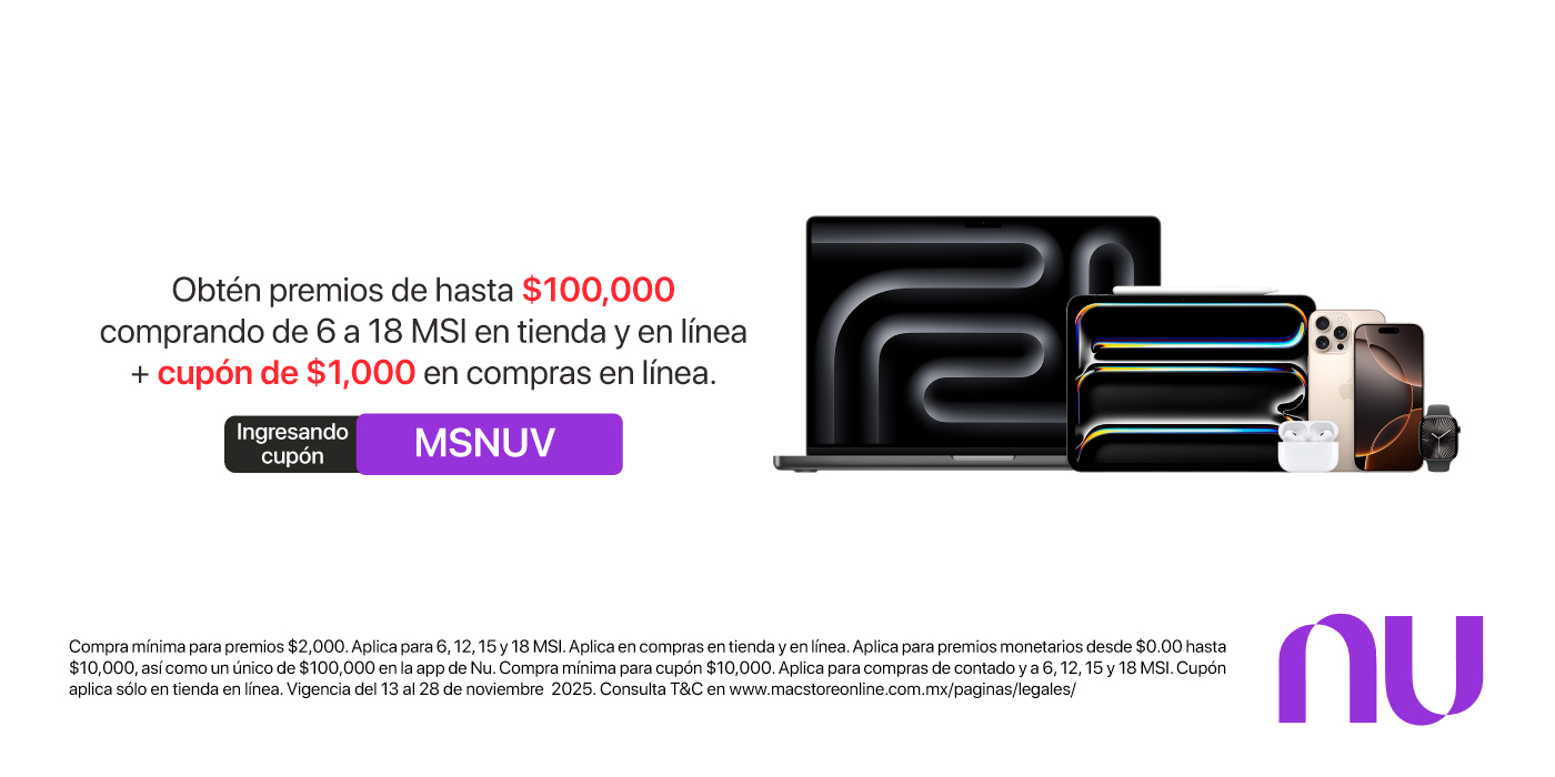 Los precios están expresados en moneda nacional. Las promociones y descuentos aplican única y exclusivamente sobre los productos, modelos y capacidades mencionadas en el sitio www.macstoreonline.com.mx no aplica con otras promociones y descuentos. Equipos sujetos a disponibilidad. Para meses sin intereses, bonificaciones, montos mínimos y máximos que se acrediten serán responsabilidad de la institución bancaria y deberá consultarlo con su respectivo banco, las tarjetas bancarias están sujetas a los términos y condiciones del contrato que regula el uso de la tarjeta y aprobación de la misma, CAT. 0% informativo a julio del 2024, el inicio de cobro de los meses sin intereses dependerá de la fecha de corte de la tarjeta de crédito.