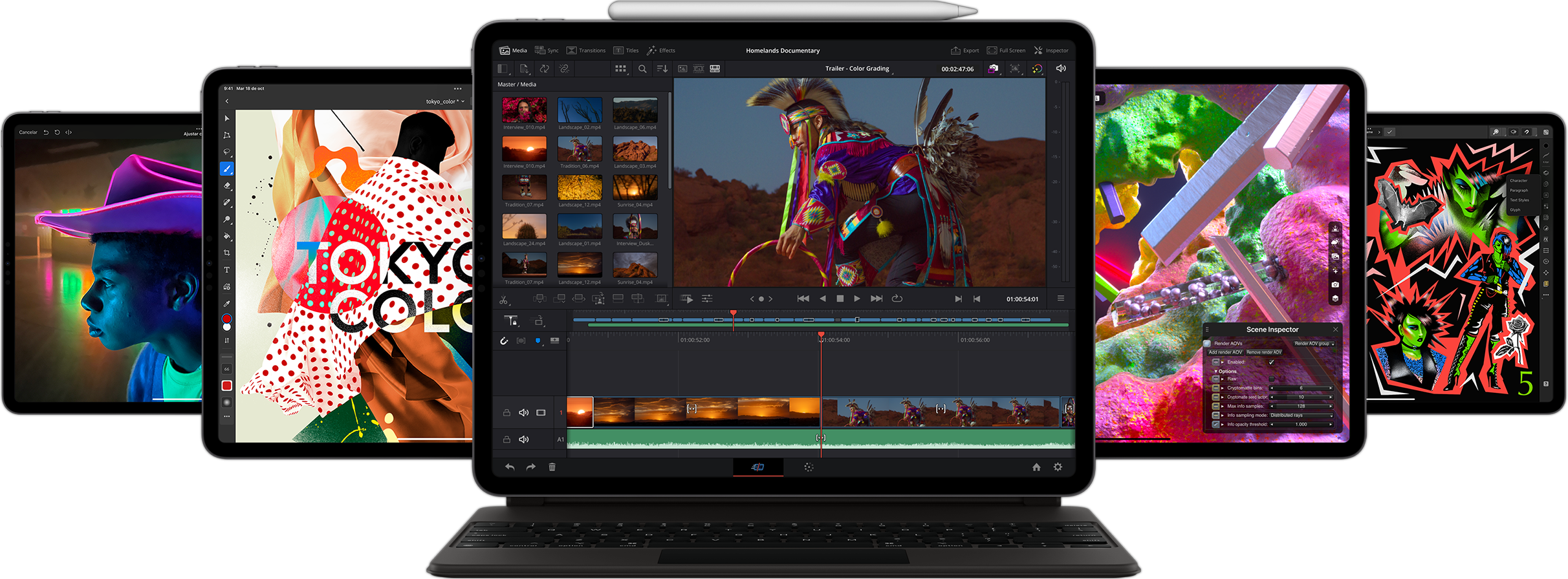 Vista frontal de un iPad Pro ejecutando la app Resolve, con el Smart Keyboard Folio y el Apple Pencil, delante de otros dispositivos iPad.