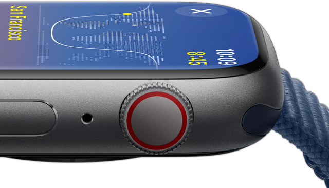 Vista lateral de un Apple Watch con el brillo al máximo.