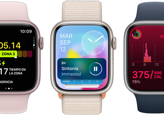Vista frontal ampliada de tres dispositivos Apple Watch.