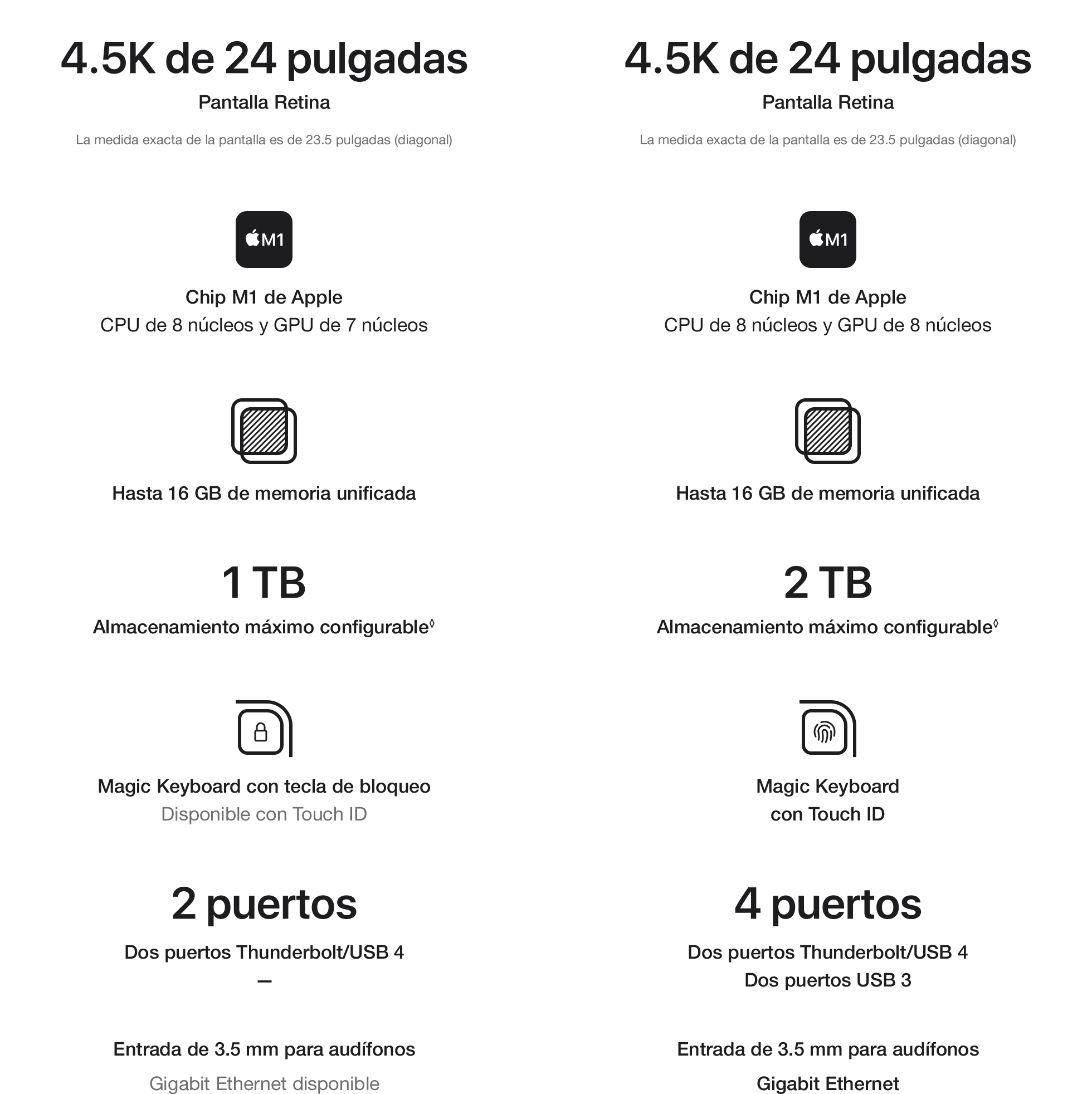 La iMac trae hasta cuatro puertos USB-C, incluidos dos puertos Thunderbolt, para conectar todos tus dispositivos favoritos. Viene con un adaptador de corriente externo con un cable tejido del mismo color que la computadora. Y también con Wi-Fi 6 y Bluetooth para que nunca te falten conexiones.