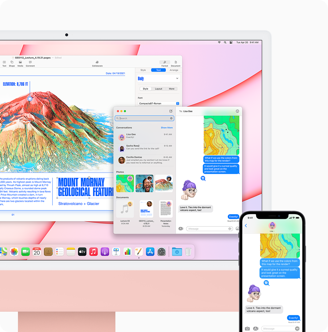 Cuando usas tu iMac y tu iPhone juntos, hacen magia. Por ejemplo, las llamadas y los mensajes de texto llegan directo a tu iMac. Es muy fácil copiar y pegar texto e imágenes de uno a otro. Y además, con AirDrop puedes compartir archivos al instante entre ambos dispositivos.