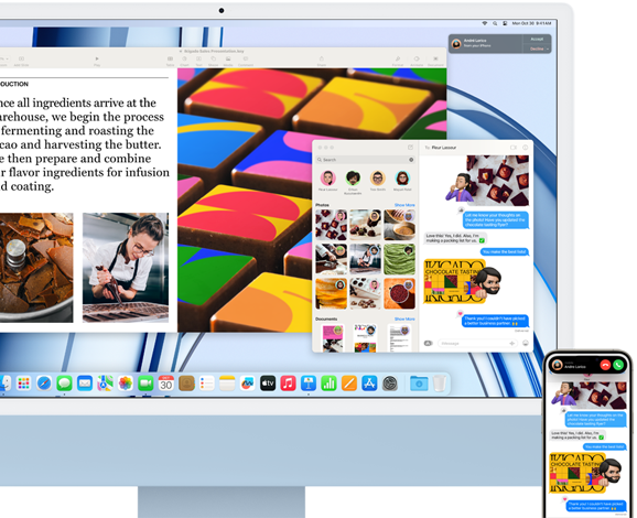 Una iMac junto a un iPhone muestran la funcionalidad Continuidad para compartir mensajes de texto y fotos entre los dispositivos.