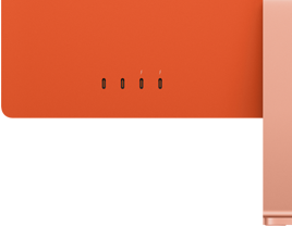 Primer plano de la parte posterior de una iMac que muestra dos puertos Thunderbolt/USB 4 y dos puertos USB 3 en la esquina inferior izquierda.