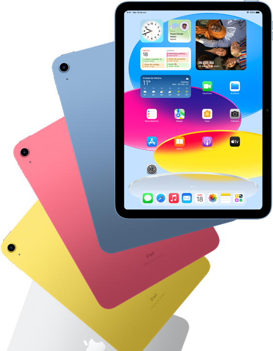 Vista frontal de un iPad con la pantalla de inicio y, por detrás, vistas traseras de otros dispositivos iPad en azul, rosa, amarillo y color plata.