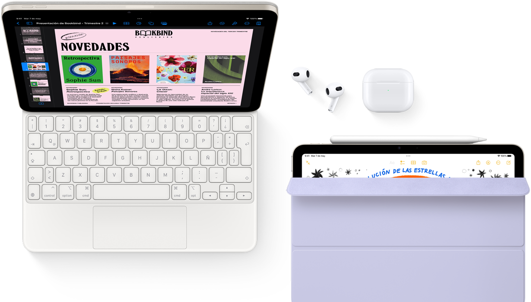iPad Air conectado a un Magic Keyboard, con Airpods Pro, Apple Pencil Pro y accesorios Smart Folio
