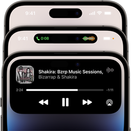 Se muestran pantallas del iPhone 14 Pro con tres estados de la Dynamic Island.