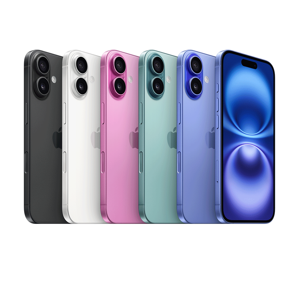 iPhone 16, parte posterior, sistema avanzado de dos cámaras en relieve, logo de Apple en el centro, cinco acabados: negro, blanco, rosa, verde azulado y color ultramarino