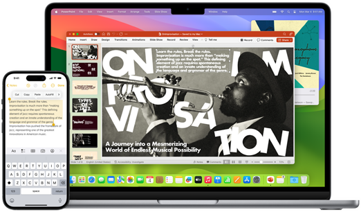 Una MacBook Air junto a un iPhone, mostrando cómo copiar un texto del iPhone y pegarlo en un documento en la MacBook Air