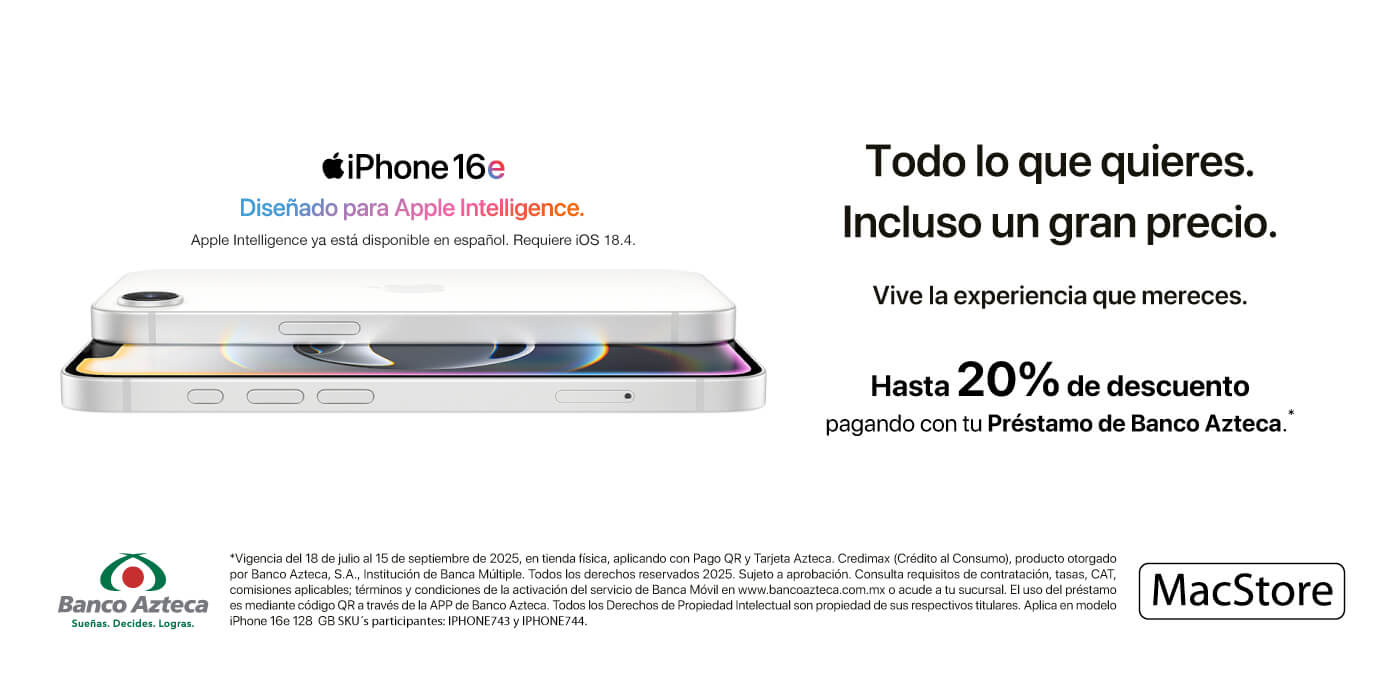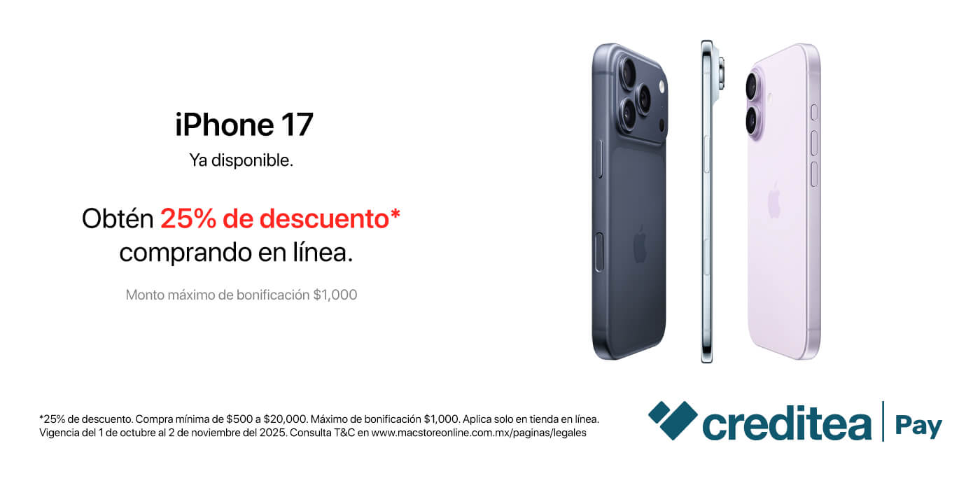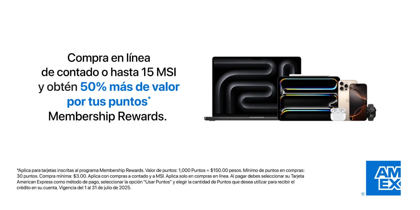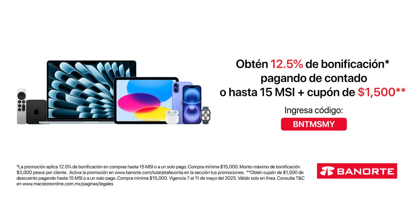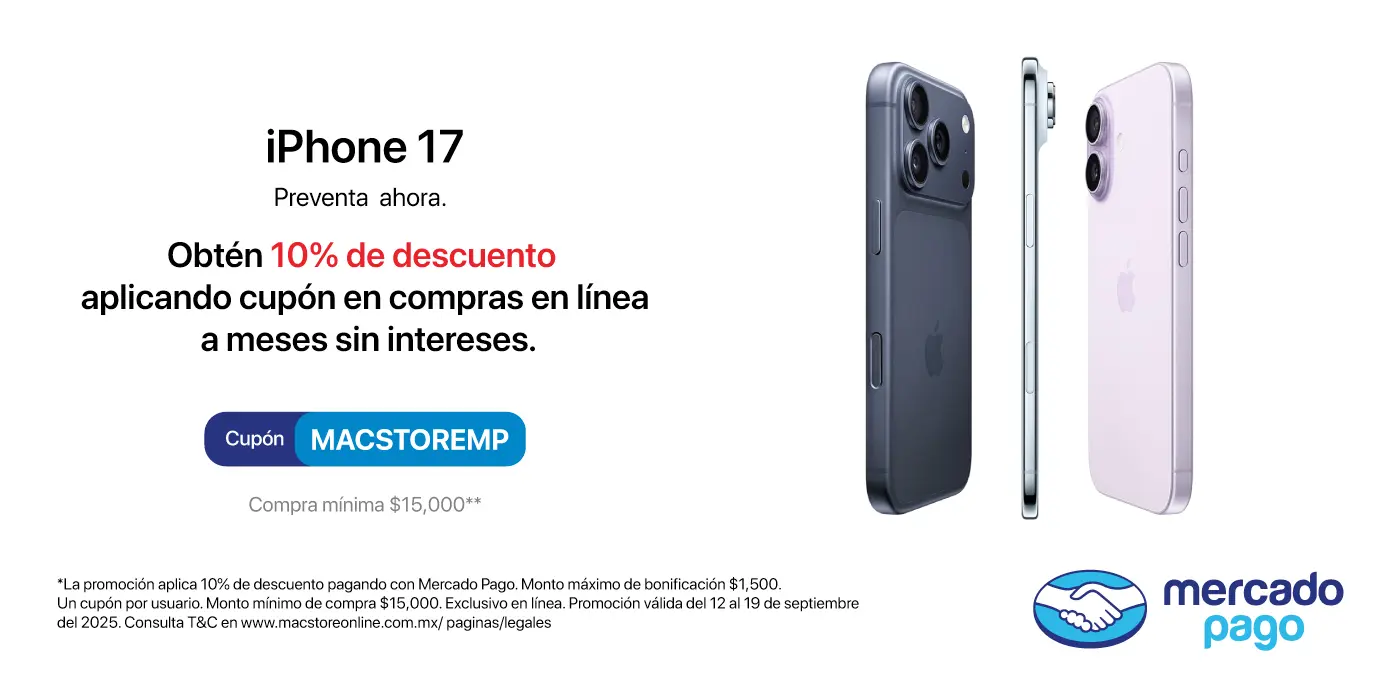 Los precios están expresados en moneda nacional. Las promociones y descuentos aplican única y exclusivamente sobre los productos, modelos y capacidades mencionadas en el sitio www.macstoreonline.com.mx no aplica con otras promociones y descuentos. Equipos sujetos a disponibilidad. Para meses sin intereses, bonificaciones, montos mínimos y máximos que se acrediten serán responsabilidad de la institución bancaria y deberá consultarlo con su respectivo banco, las tarjetas bancarias están sujetas a los términos y condiciones del contrato que regula el uso de la tarjeta y aprobación de la misma, CAT. 0% informativo a julio del 2024, el inicio de cobro de los meses sin intereses dependerá de la fecha de corte de la tarjeta de crédito.