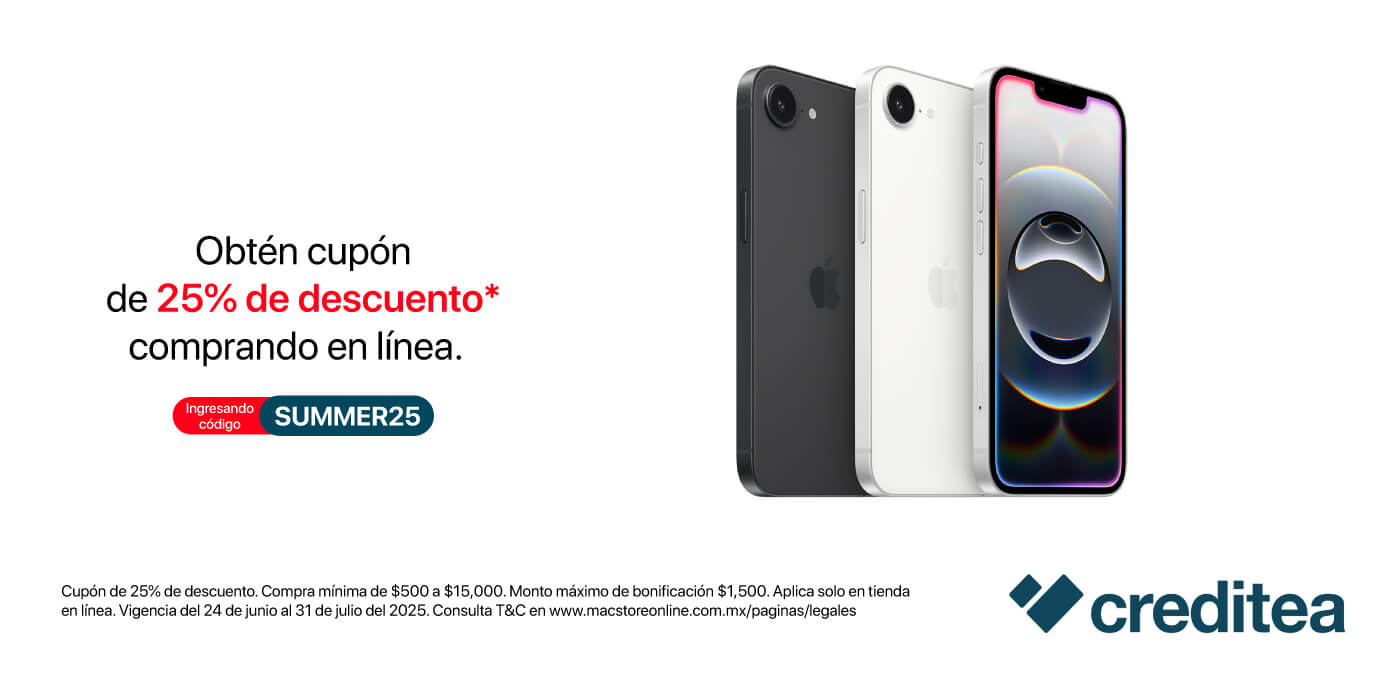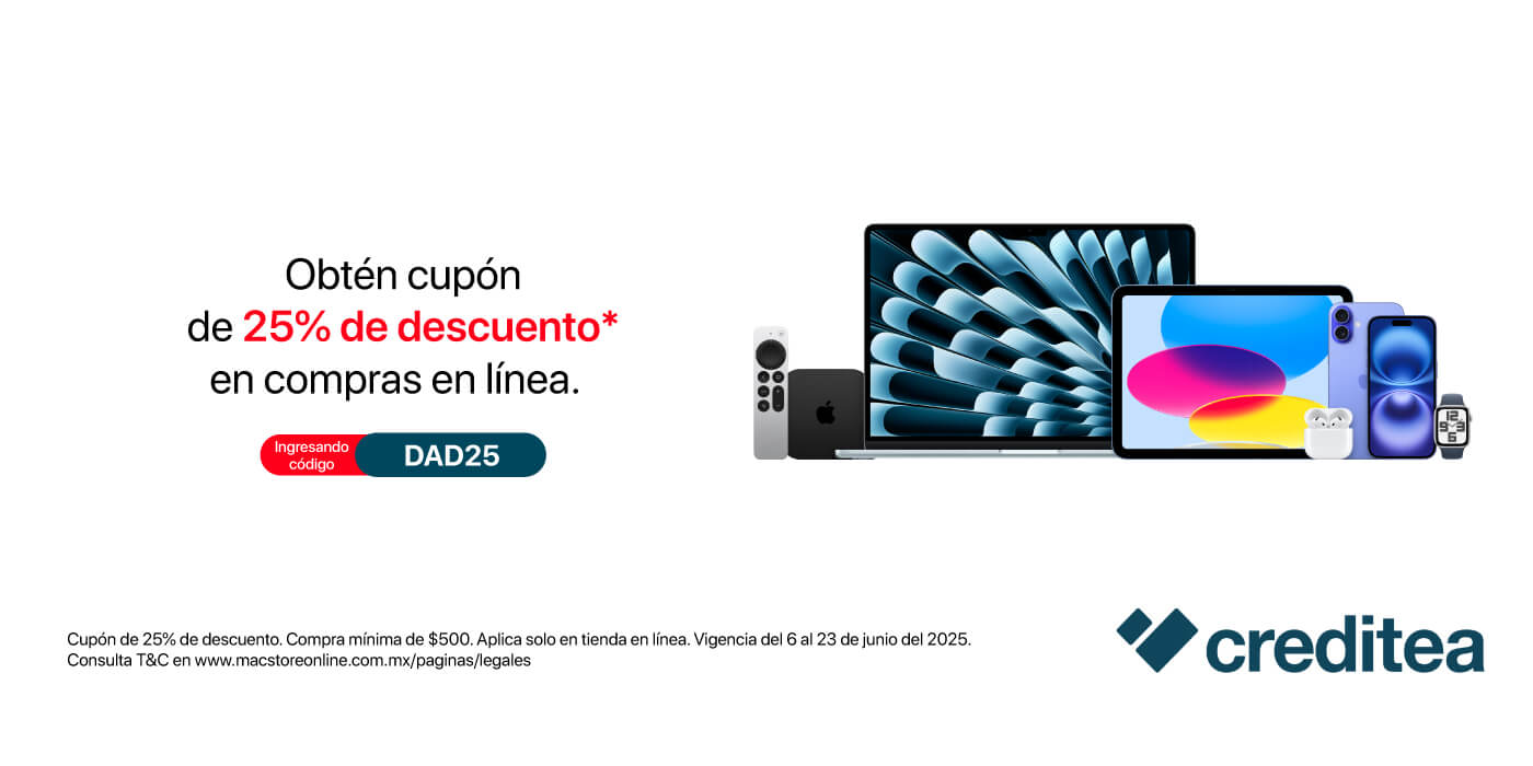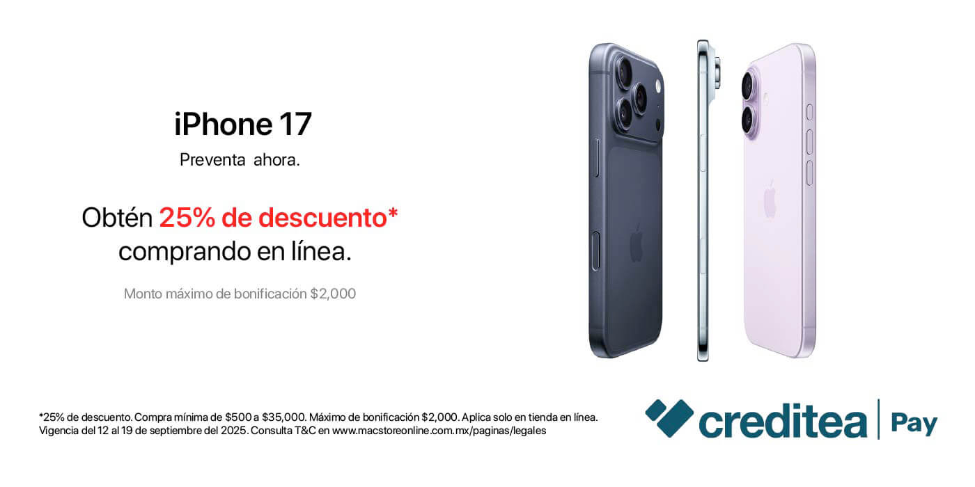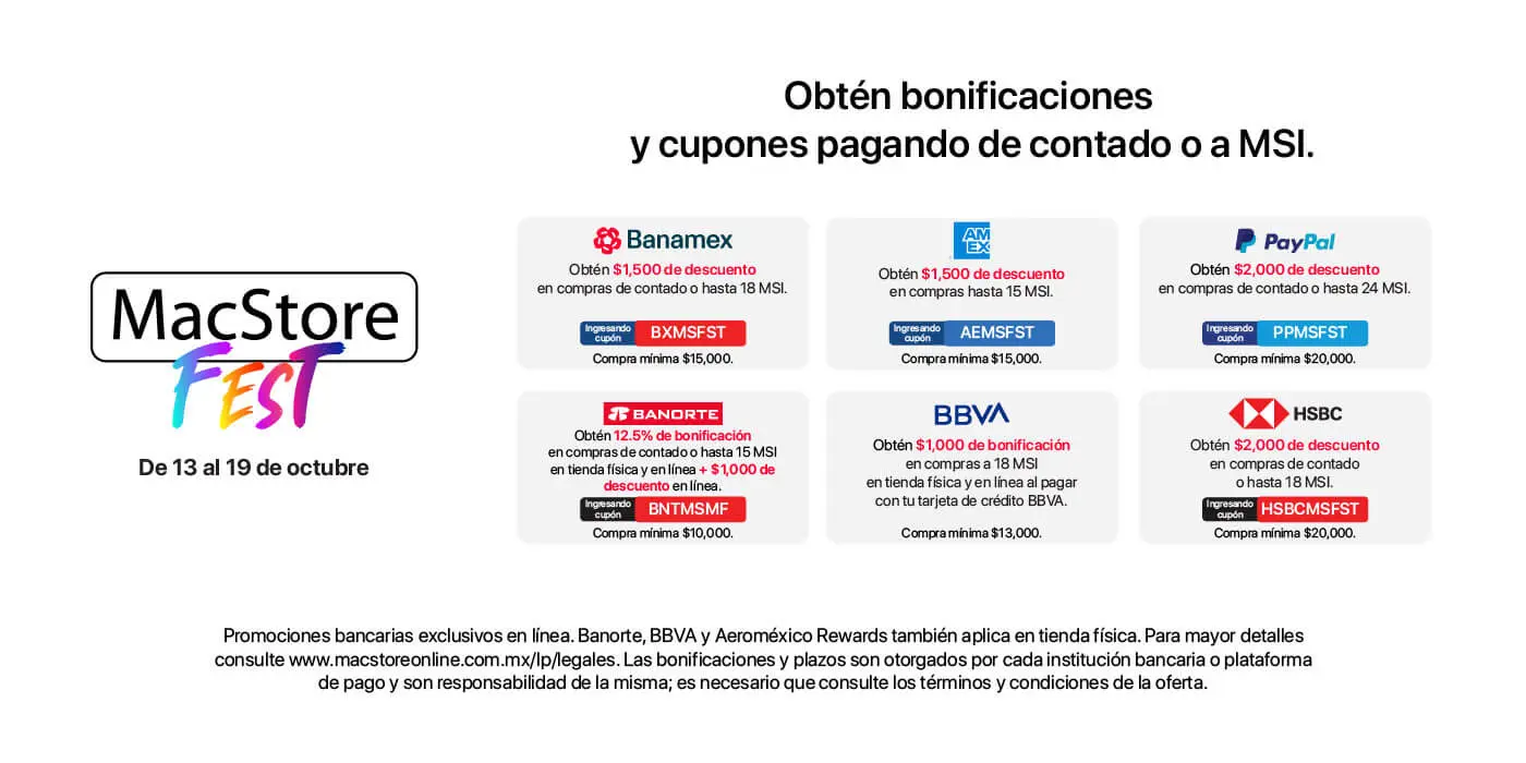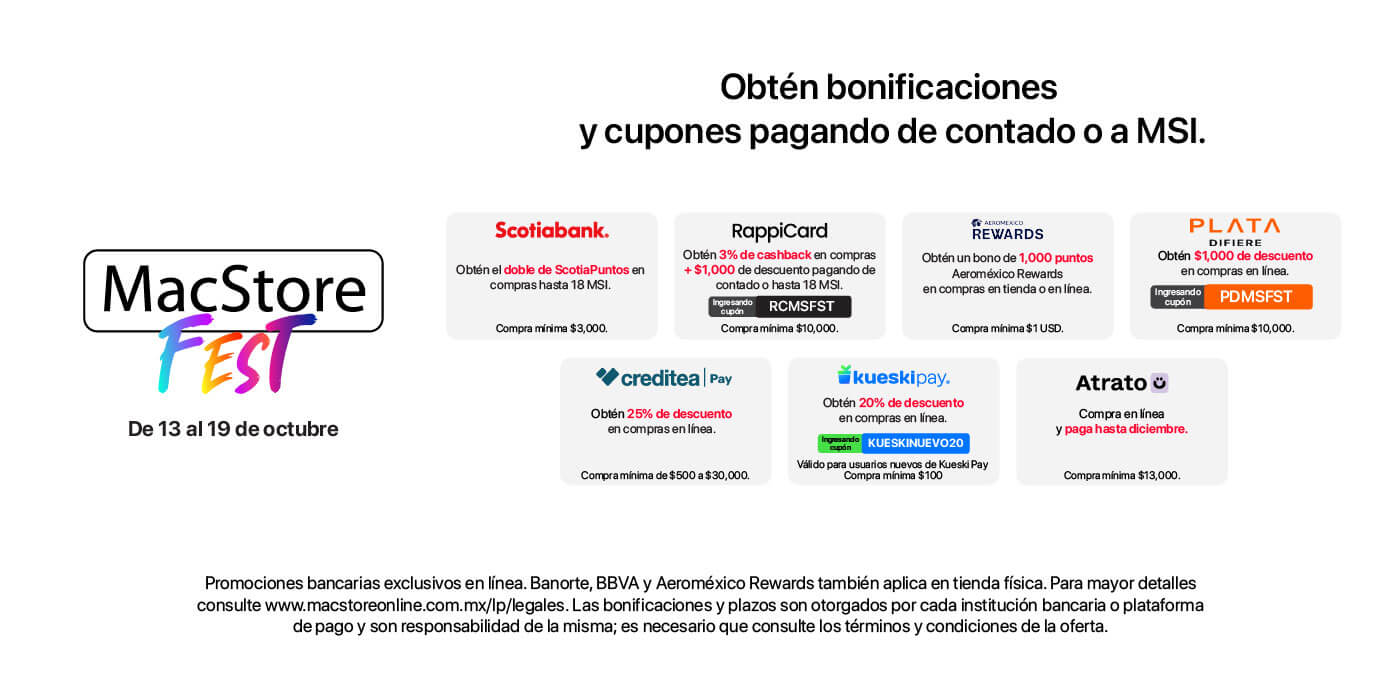 Los precios están expresados en moneda nacional. Las promociones y descuentos aplican única y exclusivamente sobre los productos, modelos y capacidades mencionadas en el sitio www.macstoreonline.com.mx no aplica con otras promociones y descuentos. Equipos sujetos a disponibilidad. Para meses sin intereses, bonificaciones, montos mínimos y máximos que se acrediten serán responsabilidad de la institución bancaria y deberá consultarlo con su respectivo banco, las tarjetas bancarias están sujetas a los términos y condiciones del contrato que regula el uso de la tarjeta y aprobación de la misma, CAT. 0% informativo a julio del 2024, el inicio de cobro de los meses sin intereses dependerá de la fecha de corte de la tarjeta de crédito.