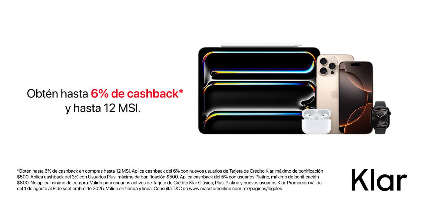 Los precios están expresados en moneda nacional. Las promociones y descuentos aplican única y exclusivamente sobre los productos, modelos y capacidades mencionadas en el sitio www.macstoreonline.com.mx no aplica con otras promociones y descuentos. Equipos sujetos a disponibilidad. Para meses sin intereses, bonificaciones, montos mínimos y máximos que se acrediten serán responsabilidad de la institución bancaria y deberá consultarlo con su respectivo banco, las tarjetas bancarias están sujetas a los términos y condiciones del contrato que regula el uso de la tarjeta y aprobación de la misma, CAT. 0% informativo a julio del 2024, el inicio de cobro de los meses sin intereses dependerá de la fecha de corte de la tarjeta de crédito.