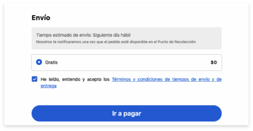 En el apartado de confirmación de compra, selecciona la casilla “Envío a punto de recolección."