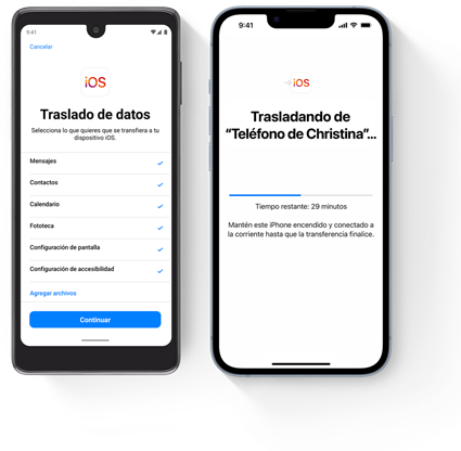 Descarga la app Trasladar a iOS en tu teléfono Android para transferir de manera segura tus fotos, contactos, mensajes y más, incluso contenido de WhatsApp.
